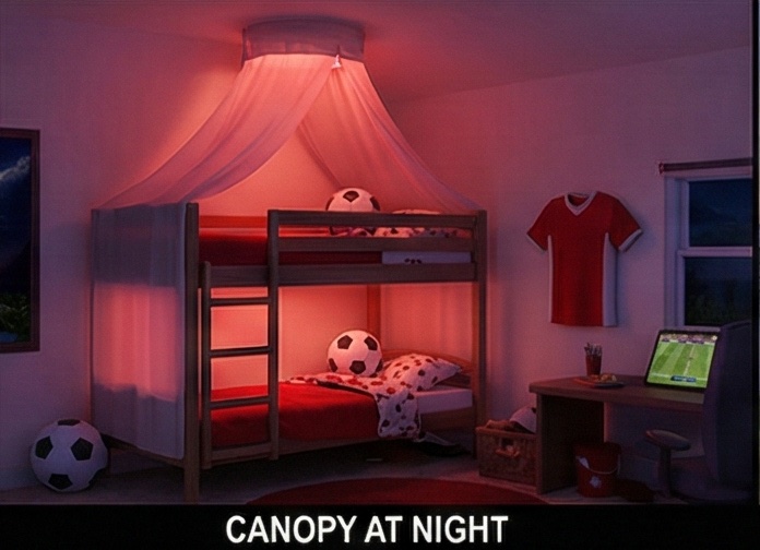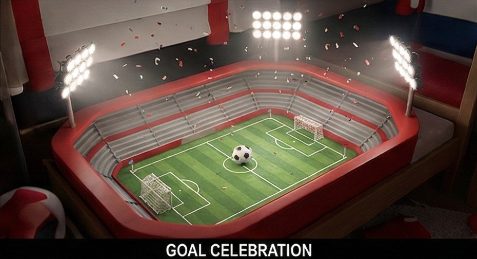 The bedroom has an amazing canopy bunk bed with a bright red duvet covered in blood drip patterns and football-shaped pillows. But here's the SECRET - underneath the bed is a MINI FOOTBALL STADIUM where Ben and Dad can crouch down and play actual football matches!