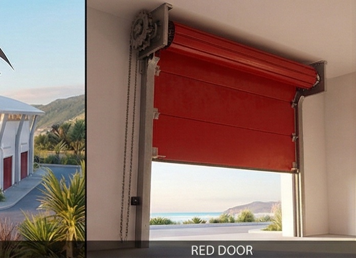 The outside has white walls, but the entrance is a BLOOD RED metal door that retracts up into the ceiling automatically - so dramatic! Inside, the ceiling is painted to look like red rain dripping down.