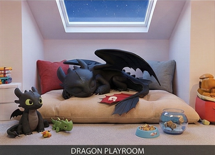 Ben's bedroom is an actual stadium with a retractable roof - and there's a very good reason for that! His pet dragon Toothful the Nightfury (a beautiful black dragon inspired by How to Train Your Dragon) needs to be able to fly in and out!