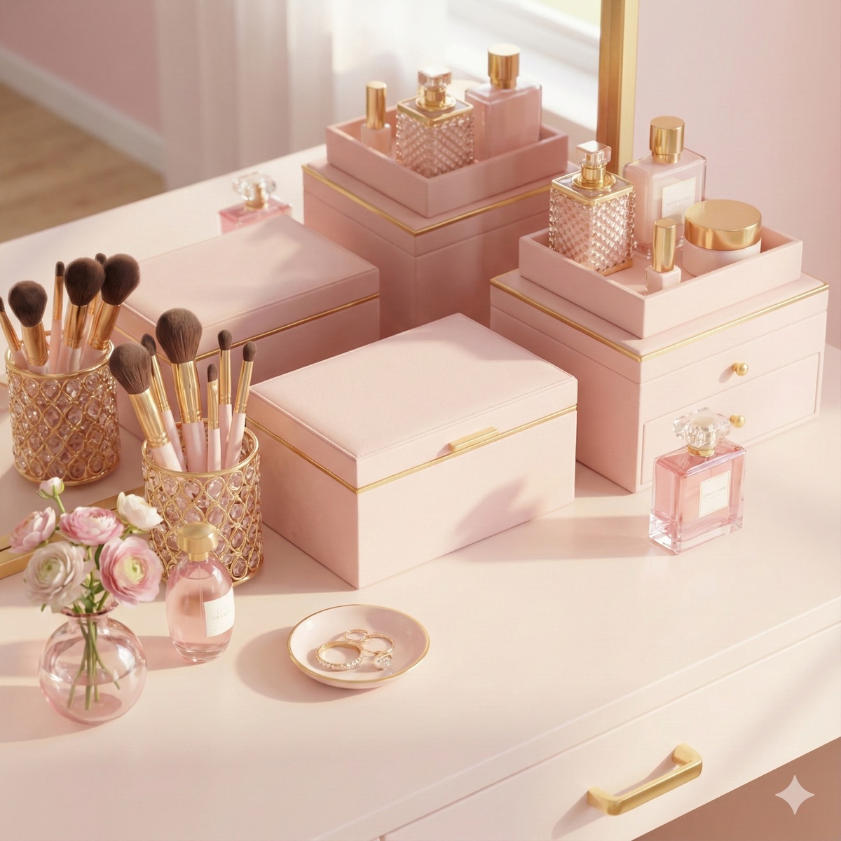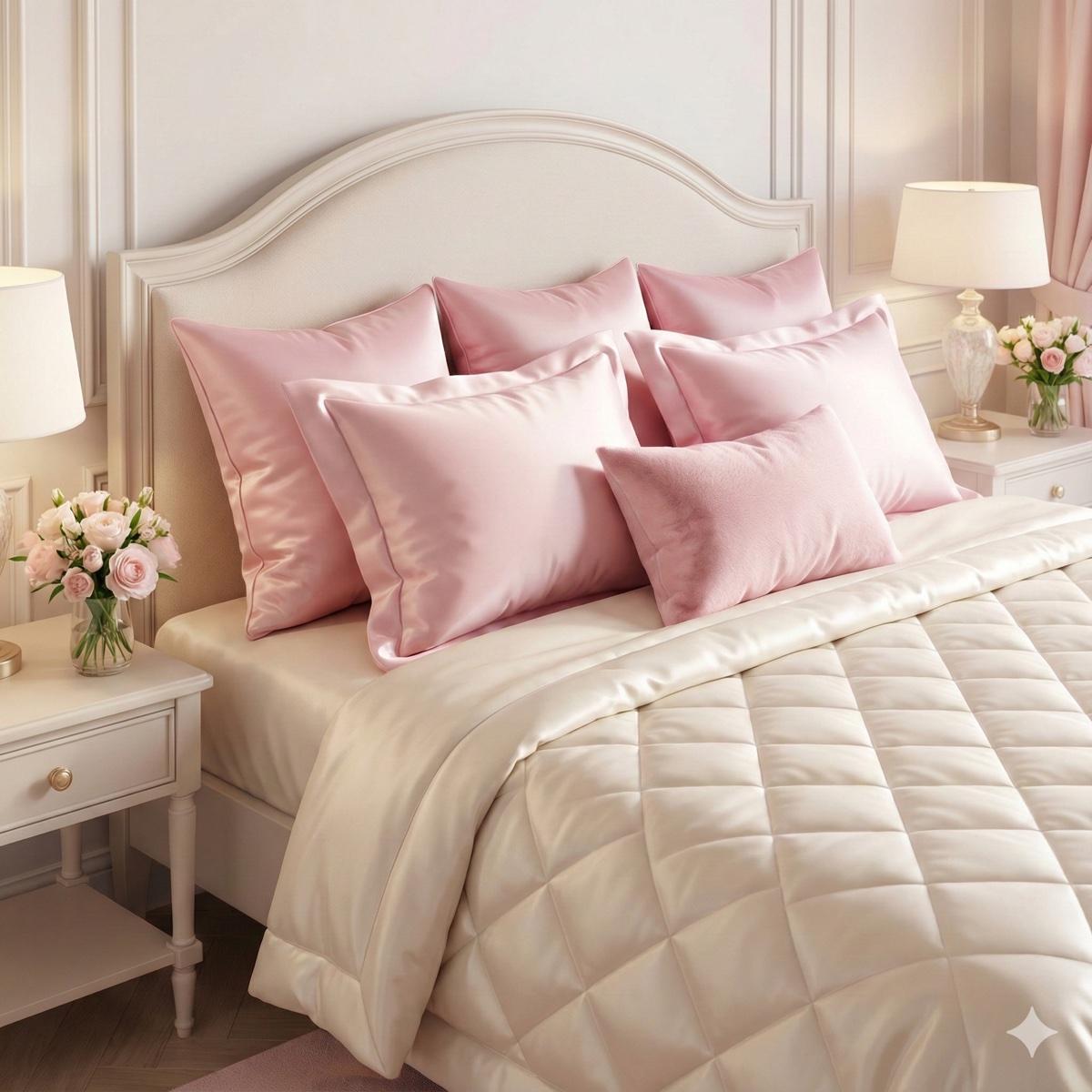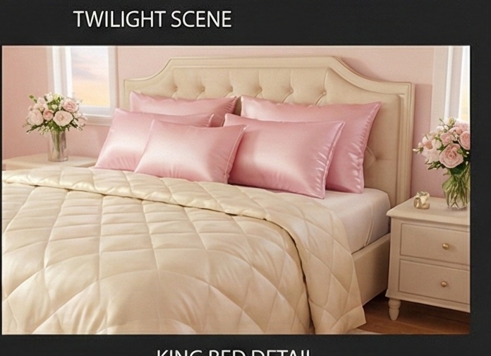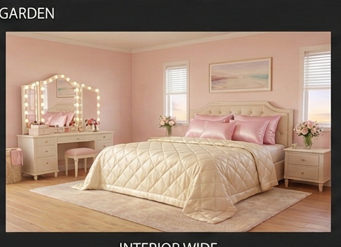 Inside is pure glamour! There's a king-size bed with a cream silk quilt and pink silk pillows - so cozy and elegant. The most amazing feature is the tri-fold Hollywood vanity mirror with lights all around it, just like a movie star's dressing room!
