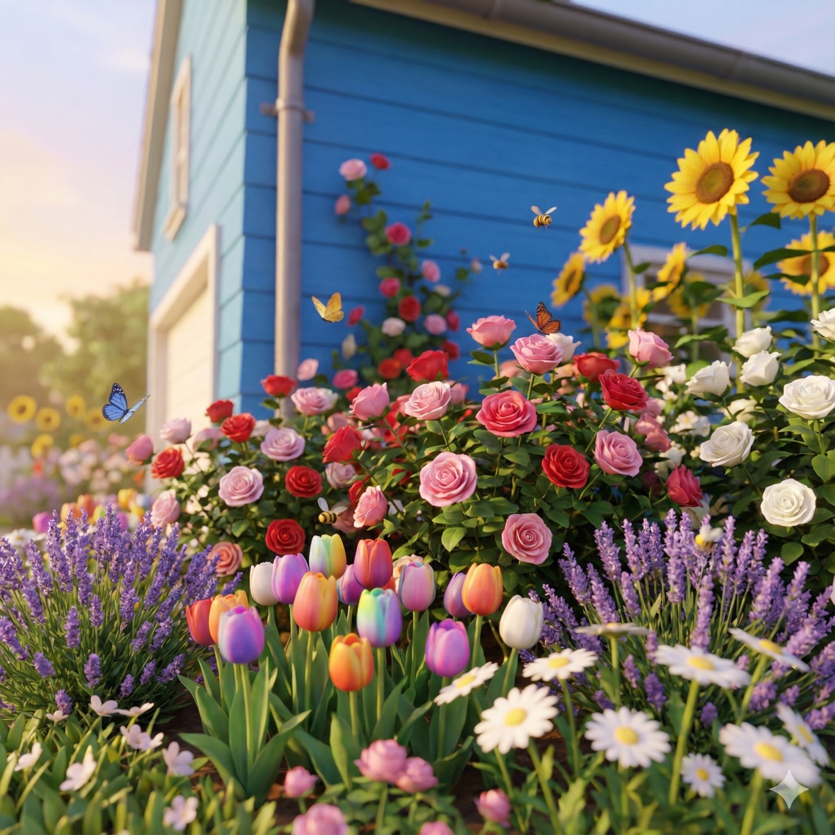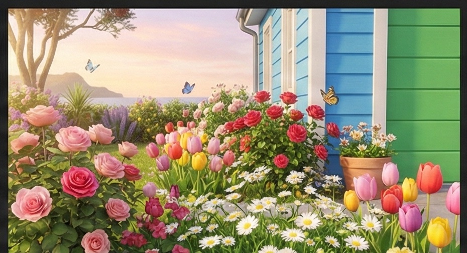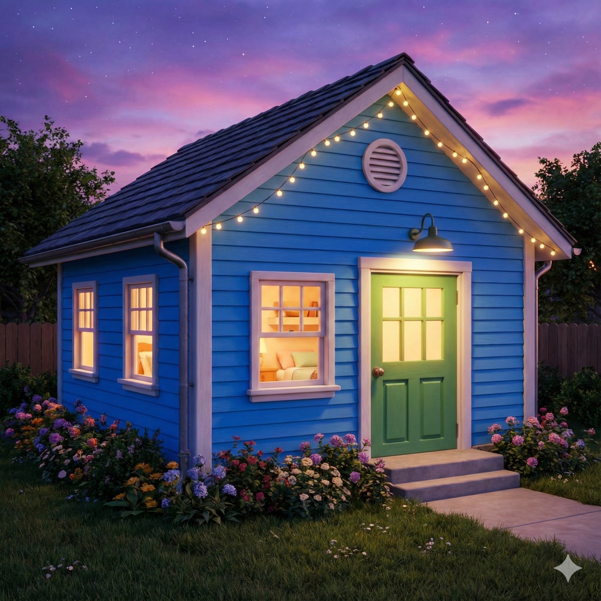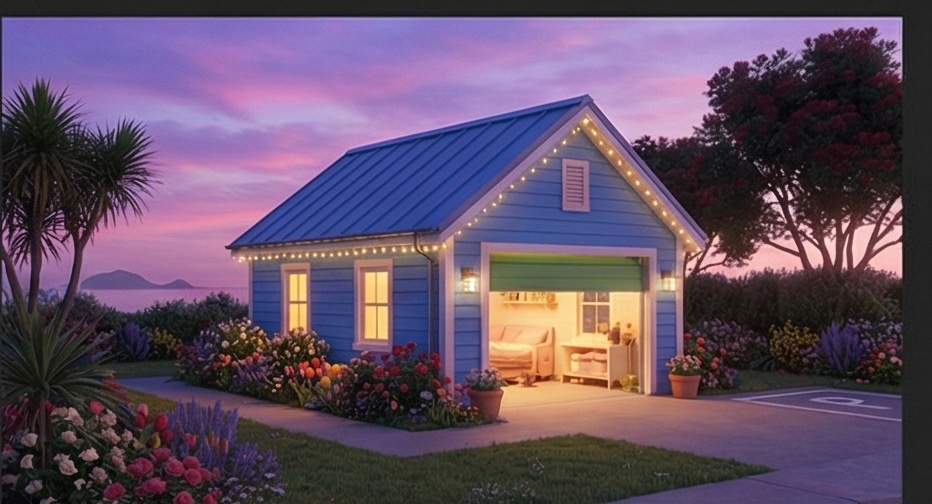 Rosie's dream bedroom is a bright blue garage with a beautiful green automatic door, surrounded by the most gorgeous flower garden you've ever seen! It's in Papamoa, New Zealand, right next to the main family house.