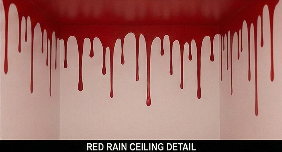 The outside has white walls, but the entrance is a BLOOD RED metal door that retracts up into the ceiling automatically - so dramatic! Inside, the ceiling is painted to look like red rain dripping down.