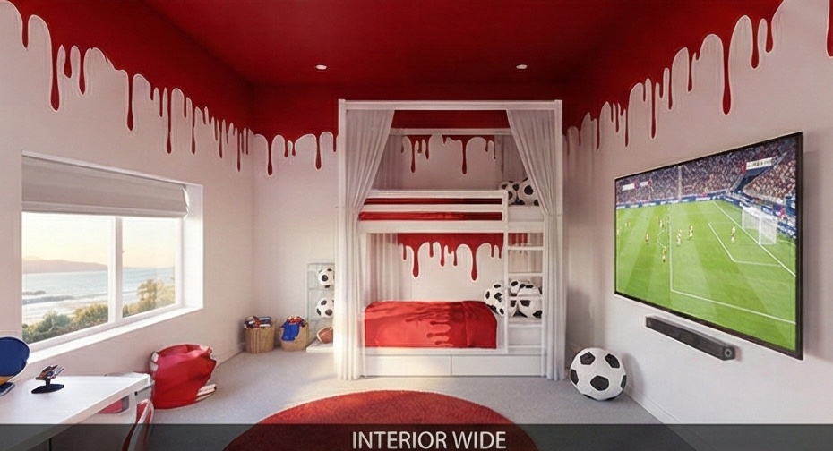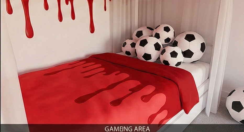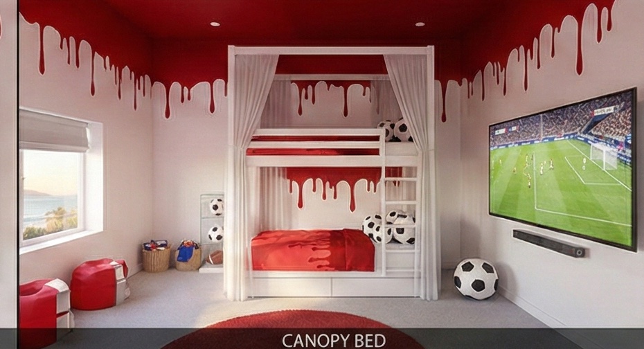 The bedroom has an amazing canopy bunk bed with a bright red duvet covered in blood drip patterns and football-shaped pillows. But here's the SECRET - underneath the bed is a MINI FOOTBALL STADIUM where Ben and Dad can crouch down and play actual football matches!