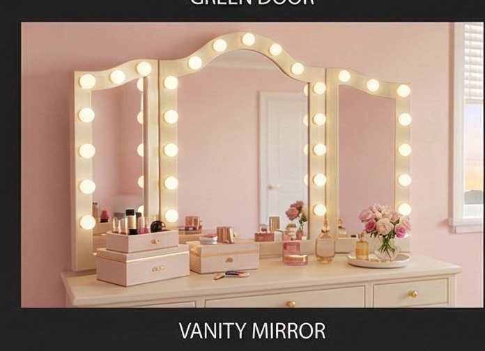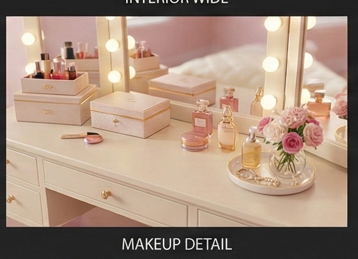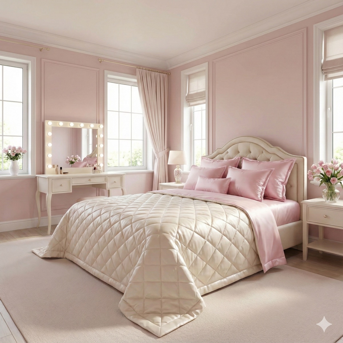 Inside is pure glamour! There's a king-size bed with a cream silk quilt and pink silk pillows - so cozy and elegant. The most amazing feature is the tri-fold Hollywood vanity mirror with lights all around it, just like a movie star's dressing room!
