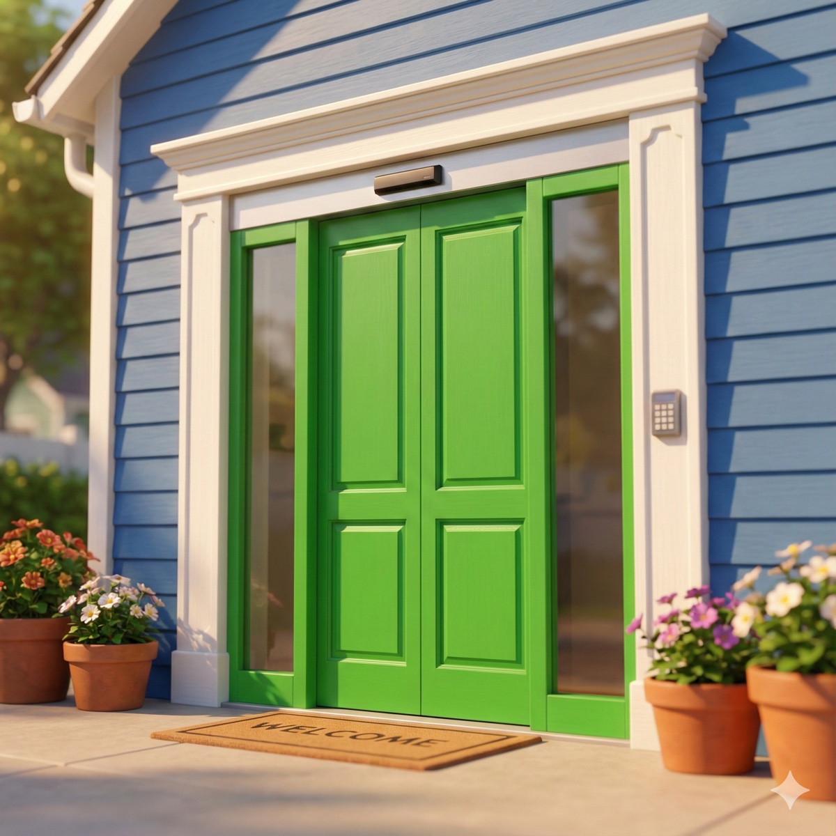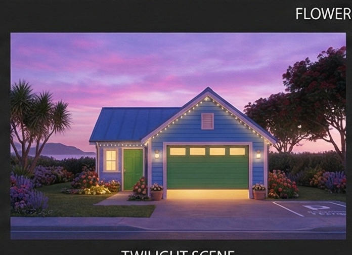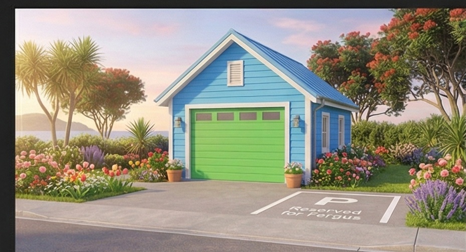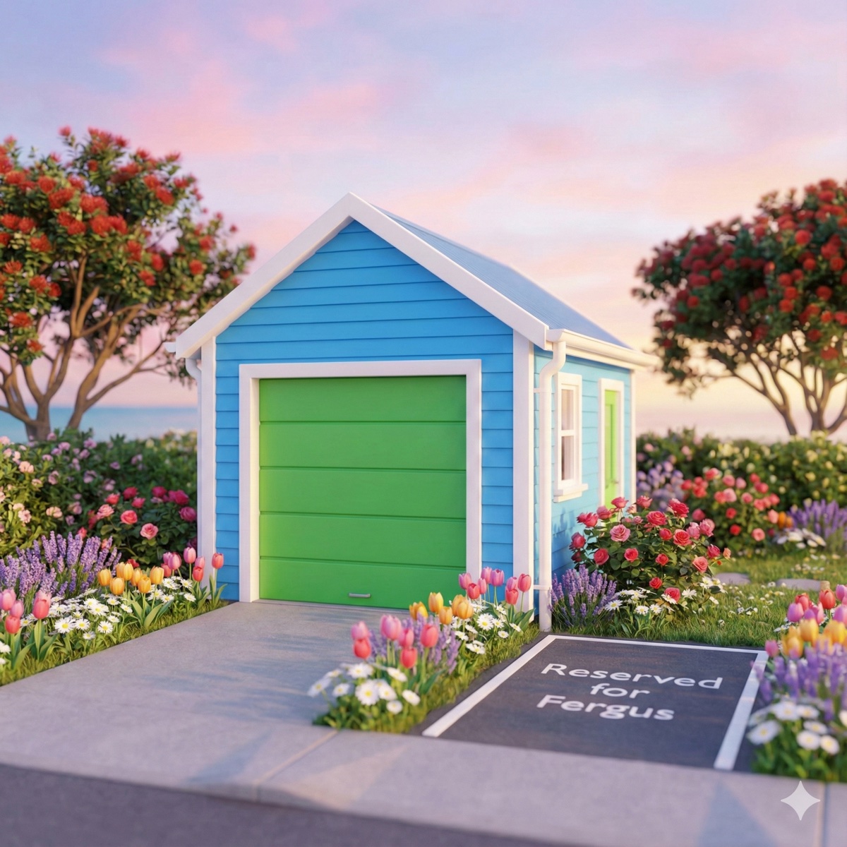 Rosie's dream bedroom is a bright blue garage with a beautiful green automatic door, surrounded by the most gorgeous flower garden you've ever seen! It's in Papamoa, New Zealand, right next to the main family house.