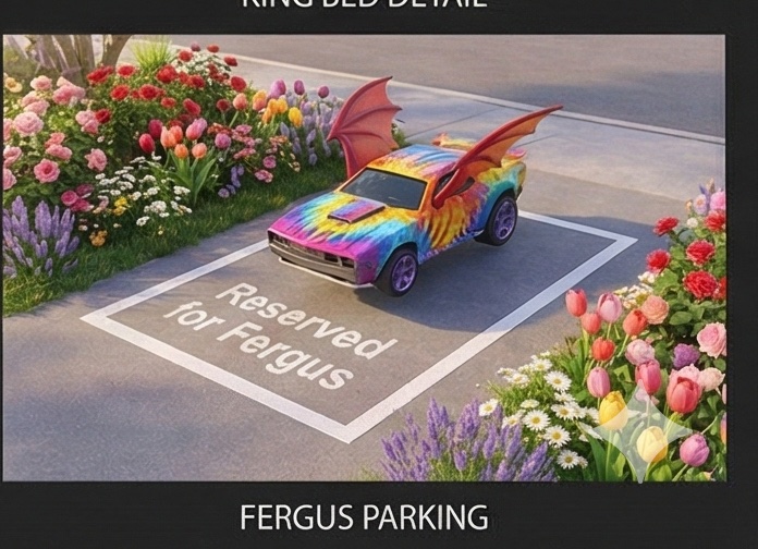 But Rosie isn't just about glamour - there's also a climbing wall and weights area for fitness. And being the best neighbour ever, Rosie has set aside a reserved parking spot outside just for Fergus's flying car bedroom!